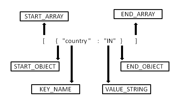 The parser generates the START_ARRAY event for the first call to the next() method and the START_OBJECT event with the second call to the next() method, and so on. The following diagram illustrates the events generated while parsing each token present in the JSON representation: